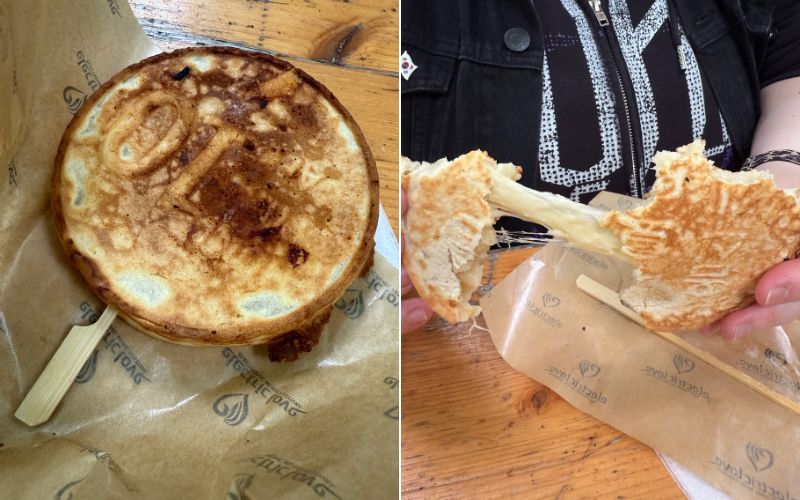 Foto links: Mein fertiger 10-Won-Pfannkuchens (십원빵). Foto rechts: Ich lasse mir meinen frischen und heißen 10-Won-Pfannkuchen (십원빵) mit Käsefüllung schmecken